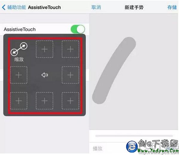 小圓點中的【自定】快捷鍵,默認有兩個手勢功能:一是縮放;二是雙擊。除了這兩個以外,還有6個手勢功能可以自定義添加。只需要點擊【自定】中的加號框就可以新建手勢。新建手勢後,就可以在Assistive Touch中更改手勢數字或添加新建的手勢了。設置成功後點擊手勢圖標,選擇對應手勢後,點擊屏幕就能出現對應數字的手指觸屏使用。