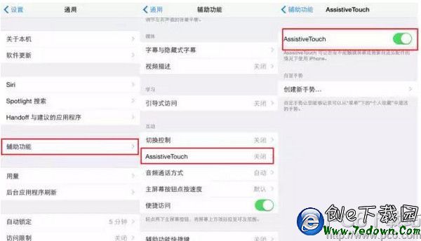 首先,進入【設置】-【通用】-點擊【輔助功能】-【Assistive Touch】選擇開啟,就可以在屏幕中調出小圓點了。這樣需要用到按鍵的功能就都可以通過小圓點來代替實現了。
