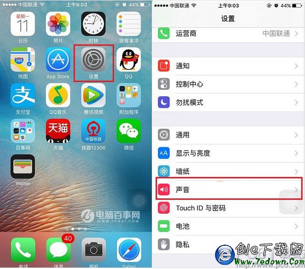 第一步:首先從iPhone SE 桌面依次點擊進入 「設置」-> 「聲音」,如圖。