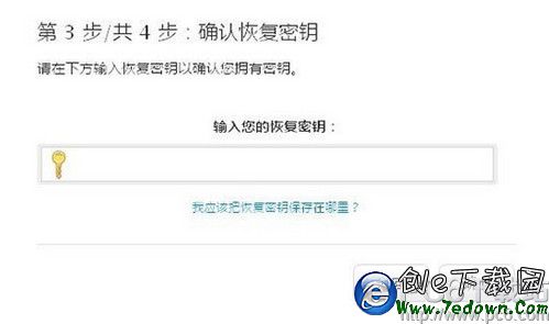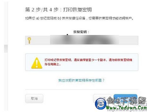 7. 設備驗證成功之後,我們會得到一個非常非常重要的恢復密鑰,最好將它抄錄在一個或者幾個不會丟失的本子上,留著以後備用。然後,系統將會要求我們輸入恢復密鑰以確認我們已經擁有了密鑰。