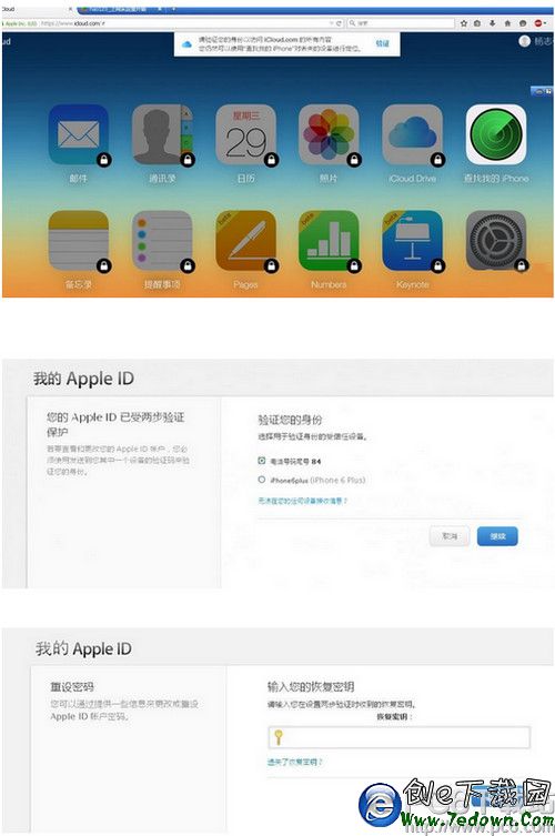 注意,完成這一步之後,我們將成功開啟兩步認證。那麼,這個兩步認證應該如何使用呢?開啟兩步認證之後,我們需要輸入驗證碼才能對 iCloud 等內容進行操作。而如果你想要修改 Apple ID 的密碼,則需要輸入上面獲得的恢復密鑰,如下圖所示。