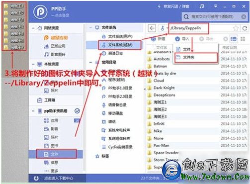 第三步,下面是自定義圖標的導入,前提下是要先DIY出PNG格式圖案(150*40像素)並放入一個文件夾。以制作好的海賊王圖標來示范,打開PP助手將該文件夾導入文件系統(越獄)--/Library/Zeppelin中即可。