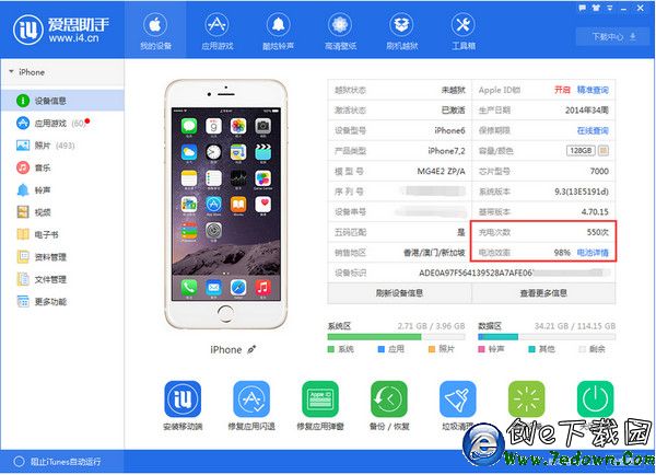 二、然後將iPhone通過數據線連接電腦,之後愛思助手就會自動識別到你的iPhone手機,並讀取您設備的信息信息,信息裡面會顯示出您電池的:“充電次數”“電池效率”,如下圖所示: