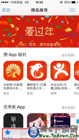 2.在這裡,我們可以看到應用商店最下方有5個菜單鍵,大家隨便選擇一項,連續點擊10下!