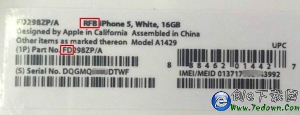 標簽特征,iPhone 5 標簽與 iPhone 5s 不一樣,是純黑的。iPhone 5 前面的“RFB”是 refurbished 的縮寫,意為翻新。官翻機序列號開頭為 DQG、DQH、C7G、C3M 等。