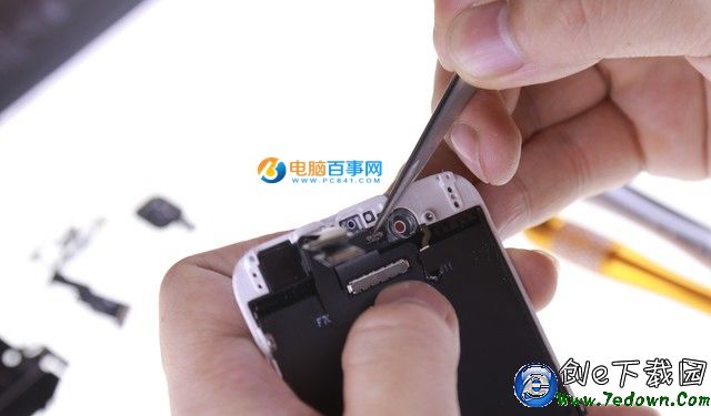 分別用撬棒撬開攝像頭排線、指紋識別排線和顯示排線以及觸摸排線,之後屏幕總成就拆下來了。如果要將屏幕交與商家處理最好繼續拆解,摘掉屏幕總成上的配件,包括液晶屏散熱貼片、Home鍵延長排線以及聽筒、攝像頭感應排線等。