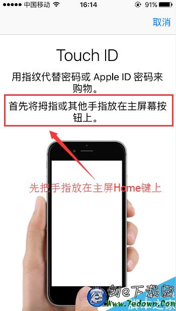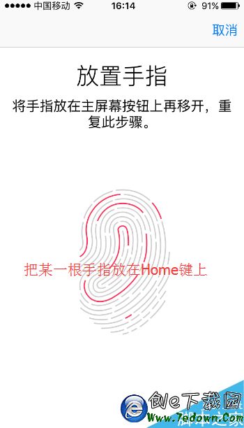 5.接著屏幕會出現“放置手指”的頁面,我們根據自己的習慣任一把自己的某一根手指放在Home鍵上。