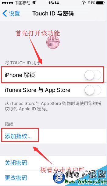 3.之後會來到“Touch ID與密碼”頁面,在這裡我們打開“iPhone解鎖”右側的按鍵,然後再點擊“添加指紋”功能。