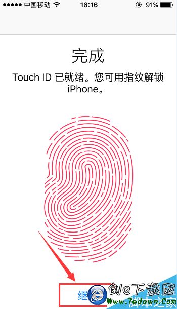 7.當指紋輸入完成後,手機屏幕會出現完成的頁面,我們點擊頁面中的“繼續”按鍵。