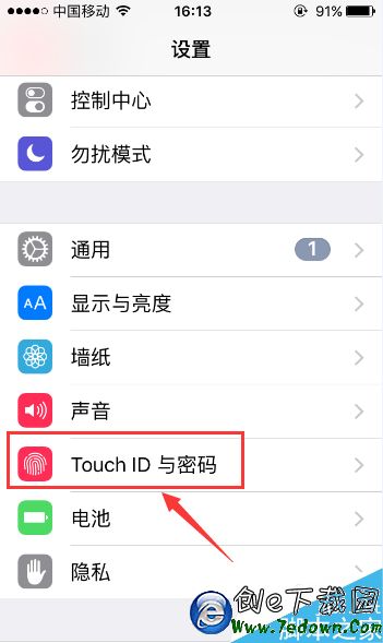 1.首先我們點擊蘋果手機的“設置”功能,然後再在“設置”頁面找到“Touch ID與密碼”按鍵,點擊該按鍵。