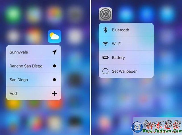應用圖標快捷操作—— iPhone 6s 和 iPhone 6s Plus 支持全新的 3D Touch 應用圖標快捷操作功能,現在包括天氣、設置、指南針、健康等應用都支持快捷菜單功能。設置應用支持快速訪問藍牙、WiFi、電池和壁紙。健康應用支持快速訪問醫療急救卡、圖表匯總等。指南針應用可以直接打開指南針或水平儀。