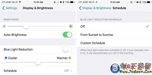 減弱藍光——減弱藍光可以自動在夜間降低 iOS 設備屏幕發出的藍光,讓 iPhone 或 iPad 的屏幕變成暖色,調查研究顯示藍光會導致用戶難以入睡。