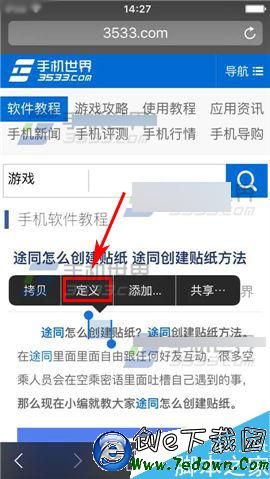 1)以點擊【Safari】為例,進入網頁後長按需要翻譯的文字,然後點擊彈出來的提示菜單中的【定義】。(PS:你也可以打開短信或者備忘錄,選擇文字即可)(如下圖)