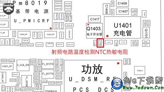 NTC熱敏電阻的電阻值隨溫度的升高而變小。利用這一特性既可制成iPhone內部溫度檢測感溫原件,偵測iPhone內部溫度。當溫度過高時iPhone進入保護狀態,停止所有程序的運行,直至溫度降至正常溫度後解除保護狀態。