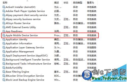 5、這時,我們將可以看到所有的服務欄目下的應用列表,找到一個名為“Apple Mobile Device Service”的欄目,雙擊打開
