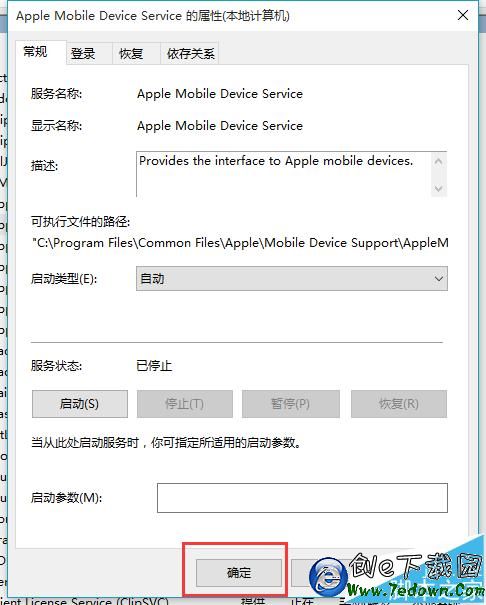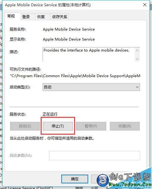 6、進入Apple Mobile Device Service屬性設置頁面,在“常規”欄目下可以看到“服務狀態”目前處於正在運行,點擊下方的“停止”按鈕