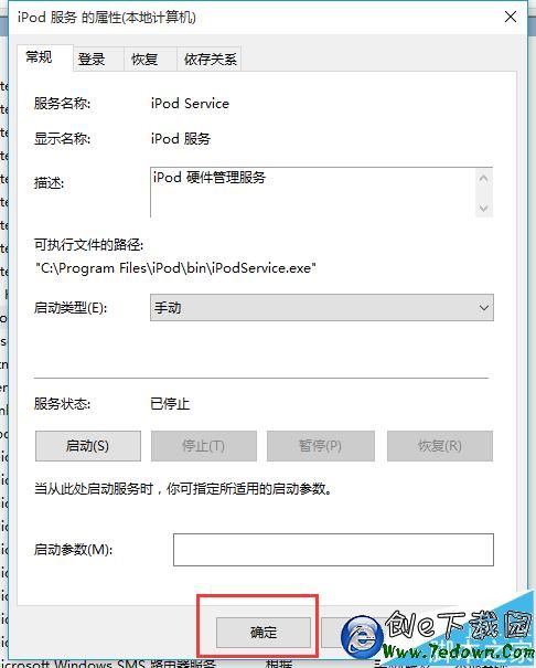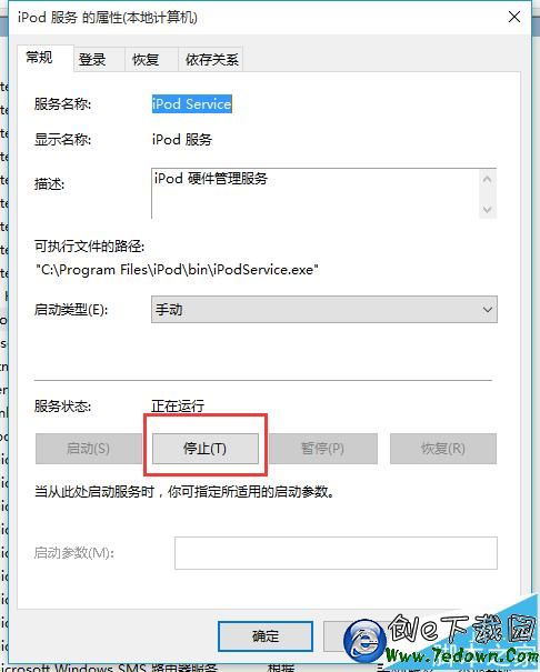 9、在打開的iPod服務屬性設置頁面中,同樣,在常規欄目下把服務狀態進行“停止”處理