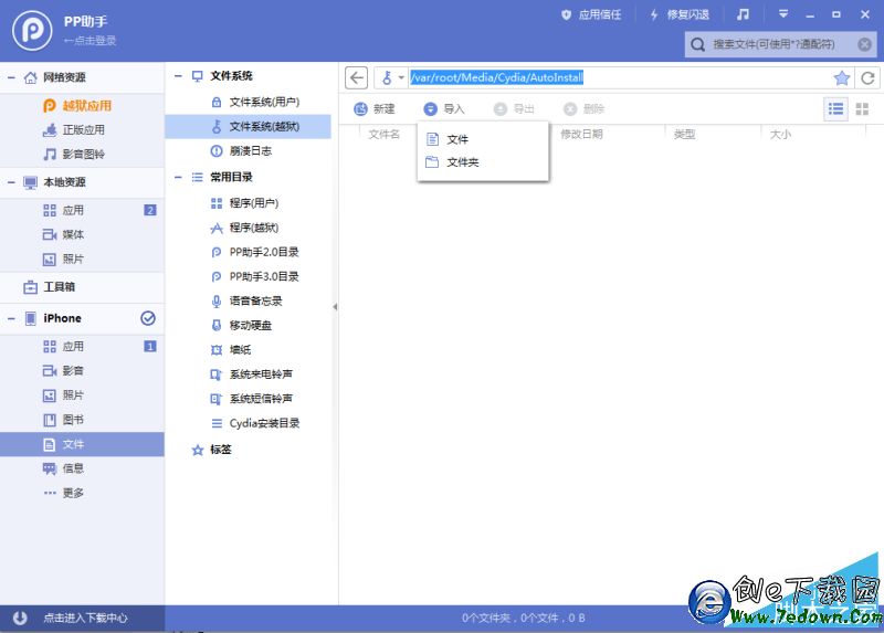 1、設備連接PP助手電腦版,將已經下載好的deb文件解壓後導入到路徑【/var/root/Media/Cydia/AutoInstall】中然後重啟設備即可。