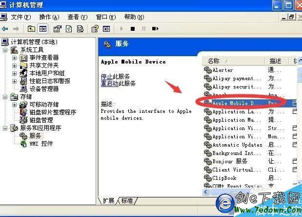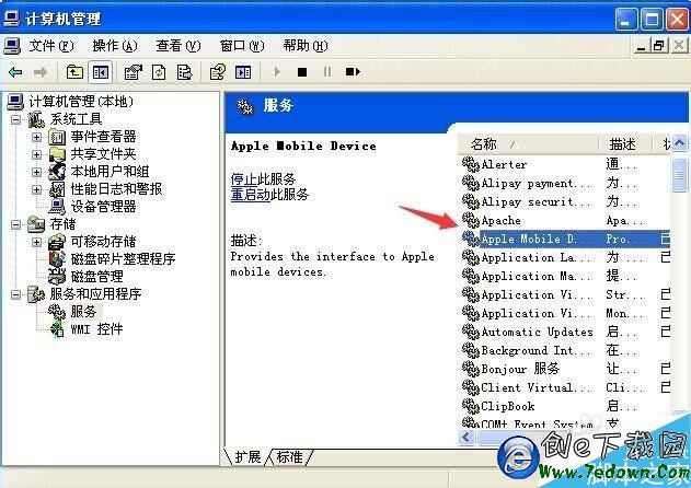 4、打開服務項後,在服務管理窗右側的一長列選項中找到“Apple Mobile Device”;