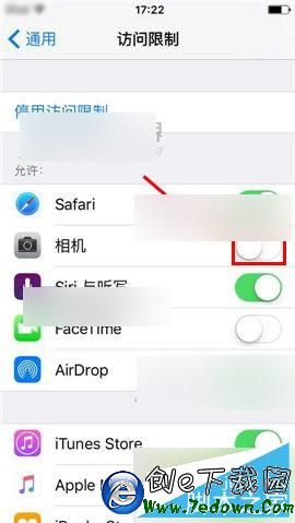 2)接著輸入【訪問限制密碼】,即是你的鎖屏密碼,進入後將【相機】右邊滑塊打開即可。(如下圖)