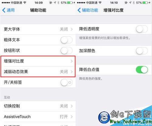 4.選擇“降低透明度”,控制中心、通知中心和文件夾的透明背景都會變黑。選擇“加深顏色”,菜單的藍色會變成深紫色。選擇“降低白點值”,整體顏色的背景都會變暗一些