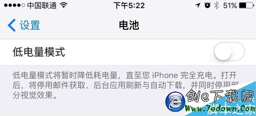 3.接著在電池的設置界面中,可以看到有一個“省電模式”選項,當啟用以後會自動降低屏幕的亮度、停用部分視覺效果、停止後台活動等。另外值得注意的是在正常模式下,屏幕頂部電池圖標的顏色為黑色。