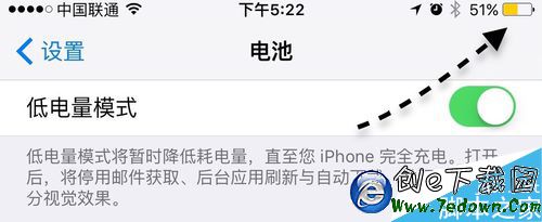 4.當我們打開“省電模式”以後,此時會明顯感覺到屏幕的亮度要低一些,並且還有一個比較明顯的地方就是頂部電池圖標的顏色為變成黃色的。