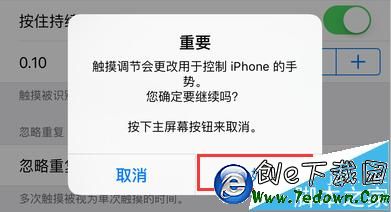 6、這時,系統將會彈出一個提醒窗口說明“觸摸調節會更改用於控制iPhone的手勢,確定要繼續嗎?”,直接點擊【好】即可