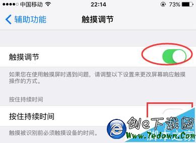 5、進入觸摸調節設置頁面當中,將【觸摸調節】右側的開關進行打開,然後重點來了,下方的【按住持續時間】目前也是處於關閉,必須打開