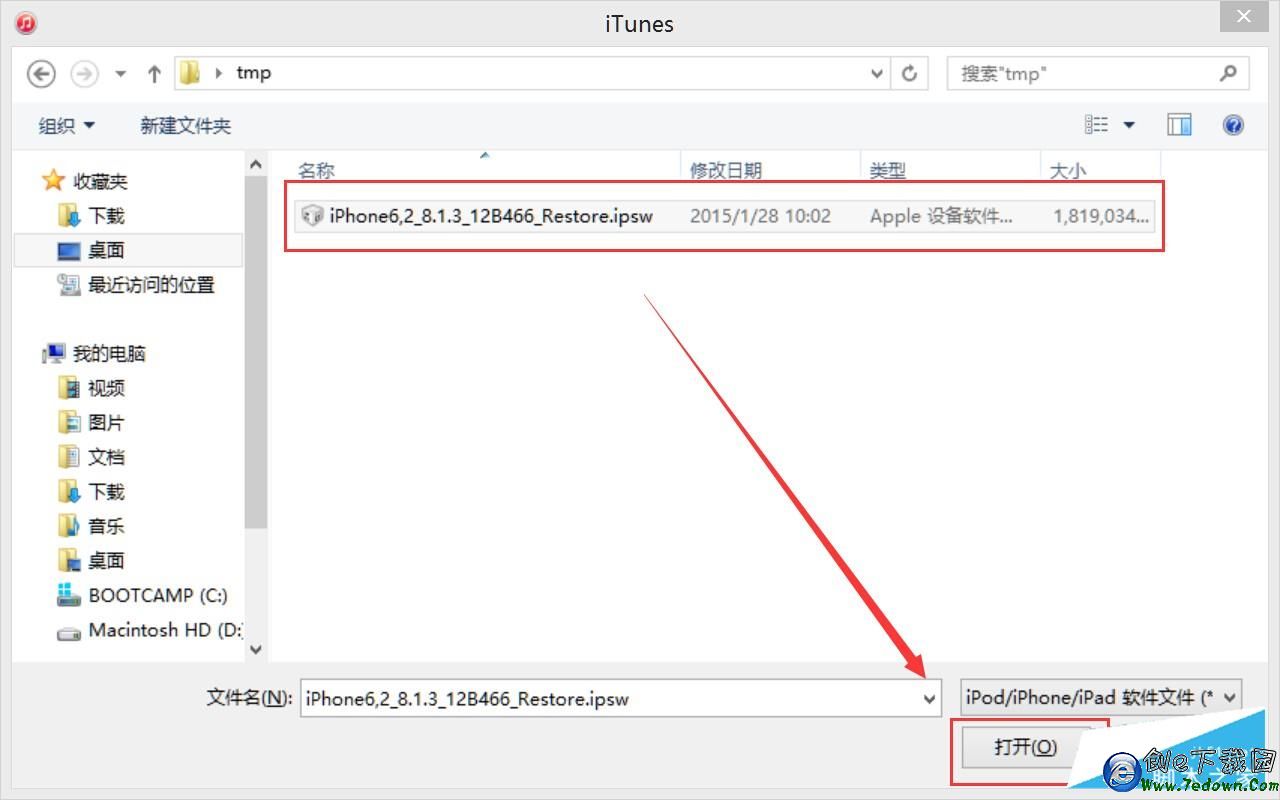 4.iTunes會彈出對話窗--請選擇已經下載好的固件(這裡截圖是iOS8固件,只要選擇iOS9固件即可);然後點擊更新--等待iTunes運行。