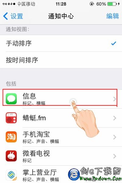 第二步,在“通知中心”頁面下方,包括很多應用程序,如電話、信息、日歷、天氣等。