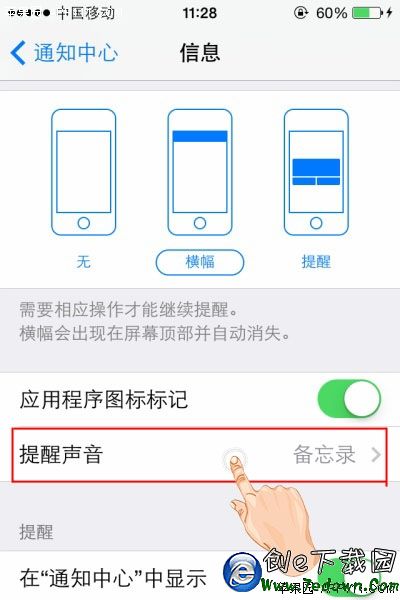 第三步,點擊進入某個應用程序(例如信息),就可以進行“提醒聲音”、“在通知中心顯示”、“在鎖屏上顯示”等設置。