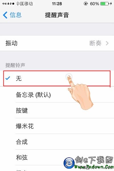第四步,點擊進入“提醒聲音”選項頁面,選擇“無”,即可設置為“靜音”模式。