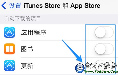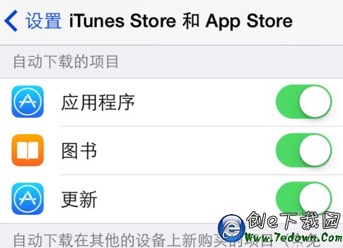 3、在 iTunes Store 和 App Store 列表中,可以對應用軟件的自動更新進行管理。在自動下載的項目下即可看到選項,如圖所示