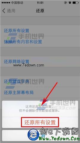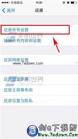 2)點擊【還原】進入,點擊第一個【還原所有設置】。(注:【抹掉所有內容和設置】會刪除所有的數據,小伙伴,別點錯了。)(如下圖)