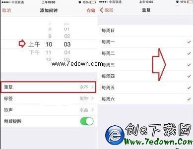 2、進入iPhone6鬧鐘添加界面,首先選好鬧鐘時間,然後再進入底部的【重復】,在這裡面可以勾選鬧鐘周一到周日鬧鐘時間,比如需要設置周一到周六鬧鐘,那麼勾選上著六個即可,大家可以根據自己的時間去選擇(在左側還可以對鬧鐘鈴聲、標簽以及稍後提醒等進行設置)。