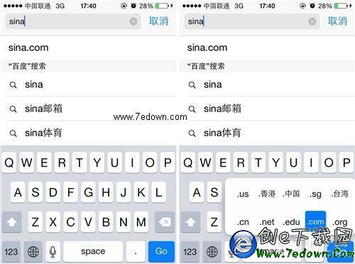 第一步:我們要打開Siri浏覽器,然後輸入想到登陸的網址,筆者在這裡輸入的是“sina.com”,不過大家習慣的操作步驟是全部輸入,包 括Url後綴,但是今天我們卻只要把鍵盤切換到全字母鍵盤,然後長按句號按鍵,就可以在句號上方看到iOS 7系統為用戶提供的URL後綴選項了。