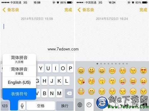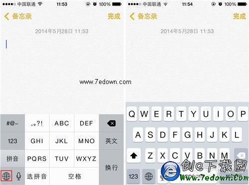 第四步:既然是要輸入表情符號,那麼我們就要打開短息或者備忘錄界面,這裡筆者選擇用備忘錄來做測試,首先用戶打開備忘錄並調出虛擬鍵盤,之後 用戶需要長按左下角的小地球圖標來切換輸入法,點擊之後系統就會顯示出切換選項,用戶可切換至簡體拼音(全鍵盤)、簡體拼音(九宮格)、簡體手寫、 English、表情符號等。