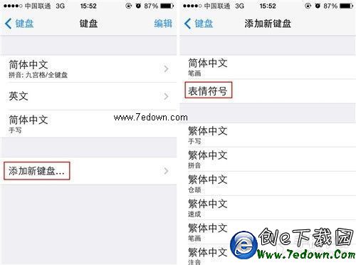 第三步:點擊進入之後,選擇“表情符號”,這時iPhone手機中的默認表情就會顯示在切換鍵盤頁面了。