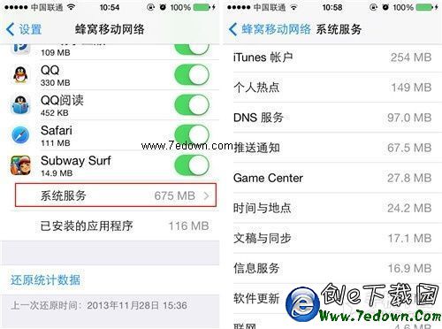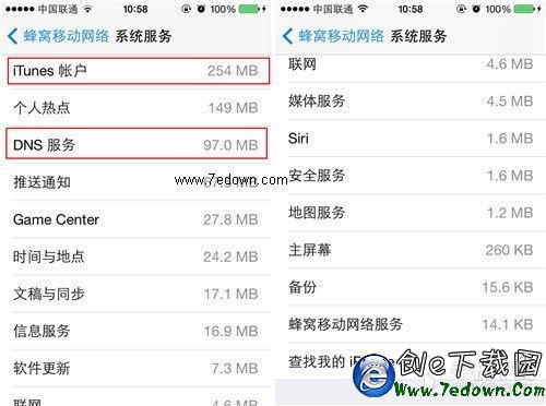 第六步:另外細心的用戶會發現在菜單的最底部有一個“系統服務”選項,這個選項是提示我們iOS設備使用流量的情況。點擊進入之後我們就可以查看每一個系統服務使用流量的情況,如測試機提示“iTunes賬戶”、“DNS服務”、“時間與地點”等是流量消耗比較多的。