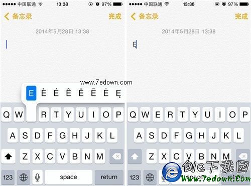 第三步:長按字母就可以看到字母上方顯示的字母特殊字符,我們從中選擇需要輸入的特殊字符即可。以字母E為例,除去大寫字母E外,相關的特殊符號還有7種,是不是覺得很有意思呢?