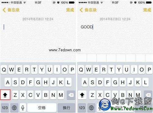 第三步:這時我們隨便找一個設備來進行測試,筆者用的是備忘錄,在備忘錄中如果我們要連續輸入大寫字母,我們只需要連續按兩下向上箭頭,就可以實現大寫字母鎖定功能,連續輸入大寫字母了。