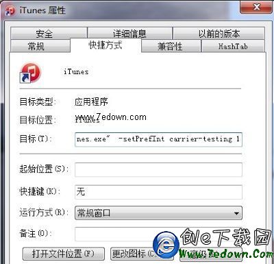 看到“目標”那個地方,然後在原始路徑位置後面添加 -setPrefInt carrier-testing 1,這裡要注意的是 -setPrefInt carrier-testing 1這個參數前面加個空格,比如我安裝在C盤更改後為 "C:\Program Files\iTunes\iTunes.exe" -setPrefInt carrier-testing 1。