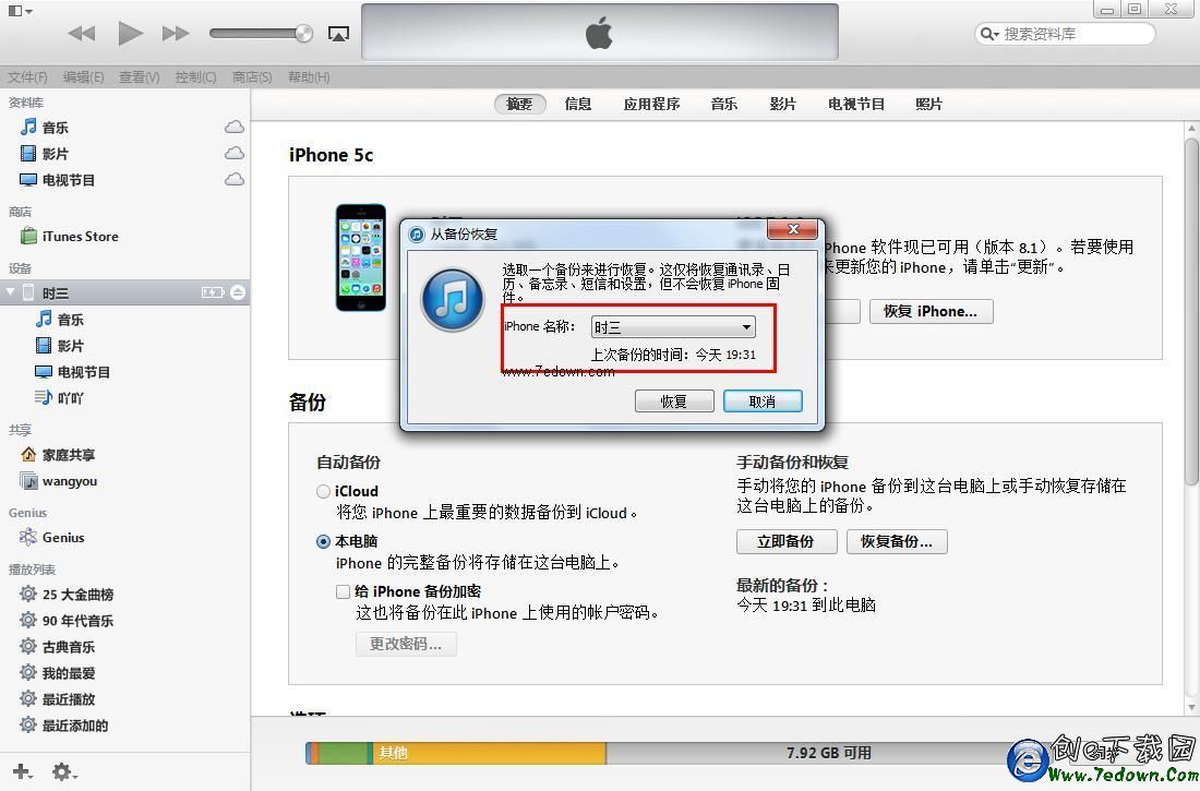 三、然後會彈出一個“從備份中恢復”對話框,這裡可以找到之前多次備份的數據,我們找到之前最新的一次備份,然後點擊下面的“恢復”,如下圖所示。