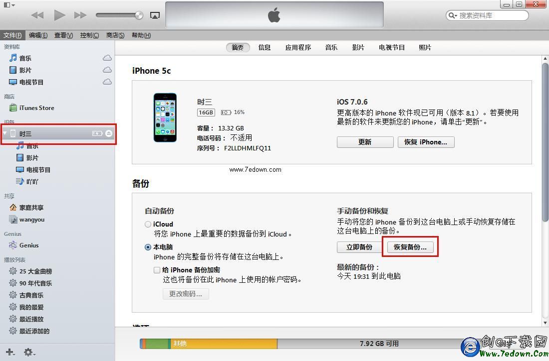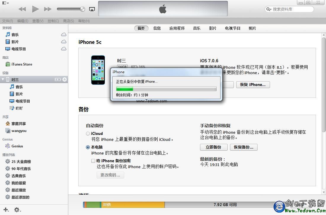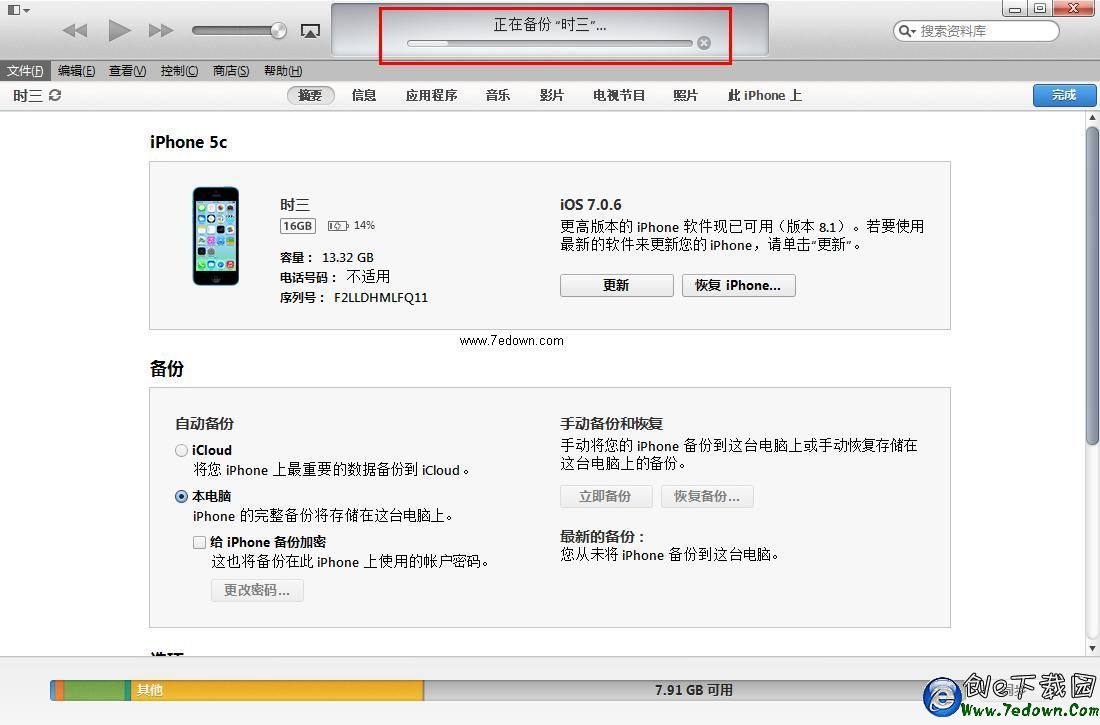 四、等到備份完成後,在iTunes界面中部的“備份”界面中,就可以看到“最新備份”時間等信息了,如下圖所示。