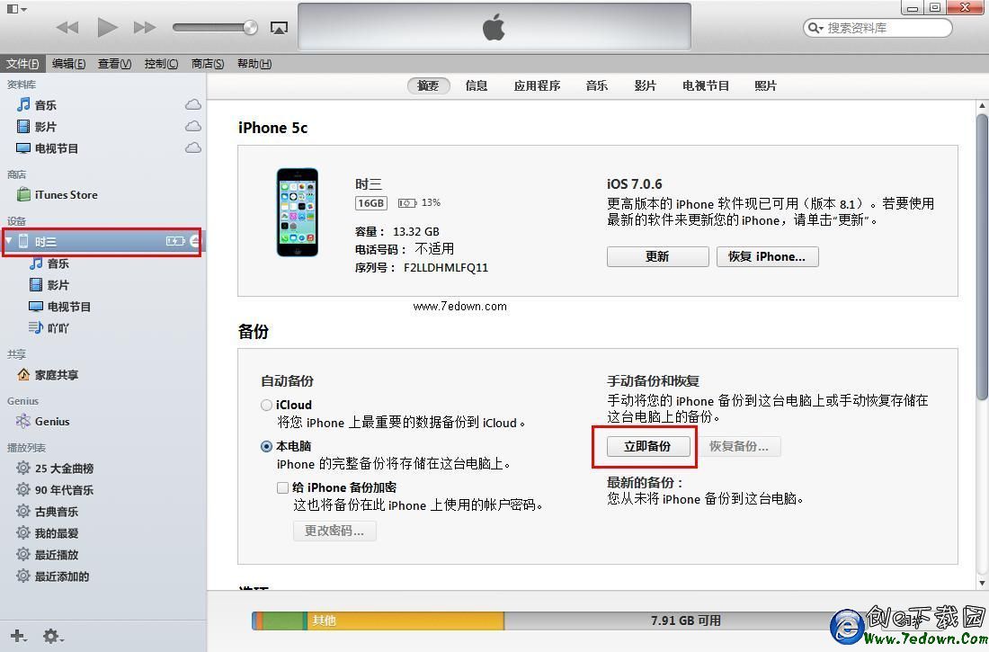 二、iOS設備連接電腦後,打開iTunes工具,然後點擊設備圖標,進行iTunes設備管理主頁,之後點擊界面上的“立即備份”,如下圖所示。