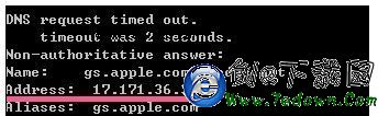 從開始菜單裡的“運行”中輸入cmd ,打開命令行窗口,打開後輸入命令“nslookup gs.apple.com”,則會找到了你地區訪問gs.apple.com所得到的真實ip,記下你的IP(標記紅色),如: