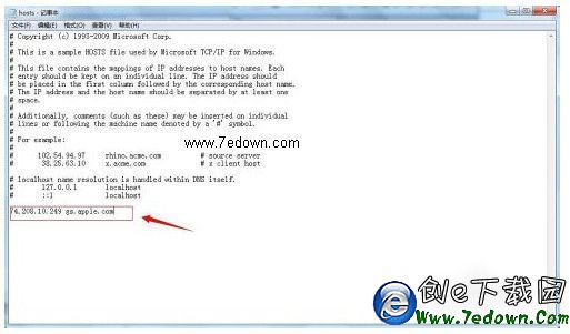 如下圖,在HOSTS文件的在最下面加上74.208.10.249 gs.apple.com