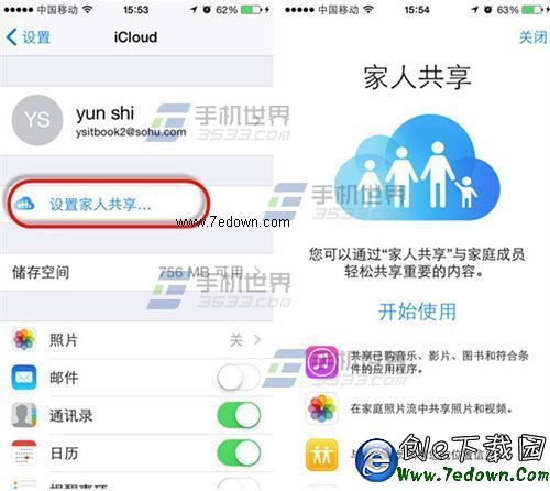1)打開iPhone5s【設置】進入【iCloud】,點擊【設置家人共享】,點擊【開始使用】。(如下圖)