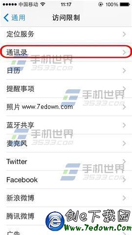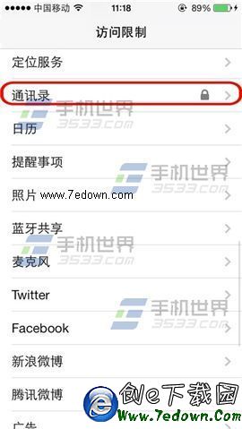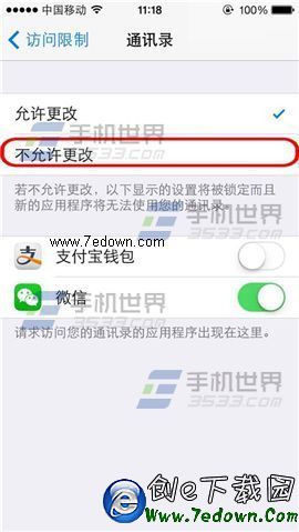 3)將【不允許更改】激活,返回訪問限制可見【通訊錄】加鎖即可。(如下圖)